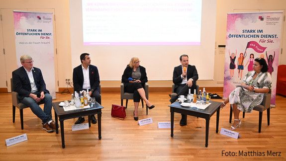 „Wie können wir die Erwerbstätigkeit von Frauen steigern? Vereinbarkeit von Familie und Beruf im Freistaat Bayern“ - so lautete der Titel der Podiumsdiskussion am zweiten Tag der Hauptversammlung der dbb bundesfrauenvertretung in Nürnberg. Neben der stellvertretenden dbb Bundesvorsitzenden und dbb frauen Chefin Milanie Kreutz diskutierten Elmar Hayn, Sprecher für Fragen des öffentlichen Dienstes des Bündnis 90/ Die Grünen im bayerischen Landtag, Arif Taşdelen, stellvertretender SPD-Fraktionsvorsitzender und Sprecher der SPD-Landtagsfraktion für Fragen des öffentlichen Diensts , Gabi Schmidt, Sprecherin Frauen und Gleichstellung der Freien Wähler im bayerischen Landtag und Matthias Fischbach, bildungspolitischer Sprecher der FDP-Fraktion im bayerischen Landtag, mit dem Publikum.