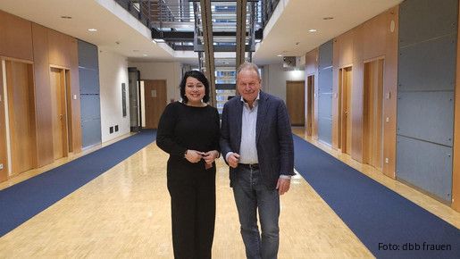 Im Austausch mit Frank Bsirske MdB (Grüne), ordentliches Mitglied im Ausschuss für Arbeit und Soziales, übergab dbb frauen Chefin Milanie Kreutz die Forderungen der dbb